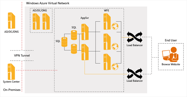 In this scenario, an organization can deploy its entire SharePoint farm in the cloud and dynamically scale all components to get additional capacity, or it can extend its on-premises deployment to the cloud to increase capacity and improve performance, when needed. The scenario focuses on organizations that want the full “SharePoint experience” for application development and enterprise content management. The more complex sites also can include enhanced reporting, Power View, PerformancePoint, PowerPivot, in-depth charts, and most other SharePoint site capabilities for end-to-end, full functionality.