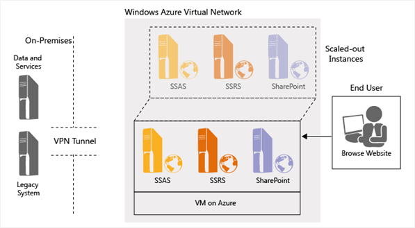 This scenario describes how organizations can use Windows Azure Virtual Machines to host mission-critical BI applications. Organizations can deploy SharePoint farms in Windows Azure Virtual Machines and scale out the application server VM’s BI components, like SSRS or Excel Services. By scaling resource-intensive components in the cloud, they can better and more easily support specialized workloads. Note that SQL Server in Windows Azure Virtual Machines performs well, as it is easy to scale SQL Server instances, ranging from small to extra-large installations. This provides elasticity, enabling organizations to dynamically provision (expand) or deprovision (shrink) BI instances based on immediate workload requirements.