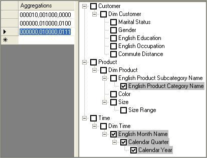 attribute. From the Time dimension, the aggregation includes the following attributes: English Month Name, Calendar Quarter, and Calendar Year. This is a redundant aggregation since English Month Name, Calendar Quarter, and Calendar Year are in the same attribute relationship tree.