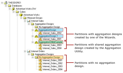 - Aggregation design created by the Aggregation Utility—The Internet_Sales_2003 and Internet_Sales_2004 partitions share an aggregation design, called AggregationUtilityExample. This aggregation design was created by the Aggregation Utility. The Aggregation Utility allows you to provide a custom name for each aggregation design.