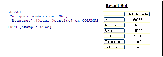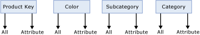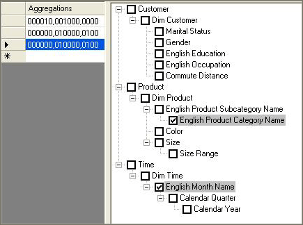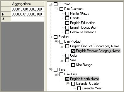 The aggregation highlighted in Figure 33 identifies an aggregation with attributes from two dimensions: Product and Time. From the product dimension, the aggregation includes the English Product Category Name