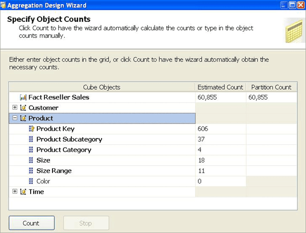 With the aggregations processed, you can use the Aggregation Utility to evaluate the relative size of each aggregation compared with the fact data for the partition. Using this information, you manually eliminate relatively large aggregations that take a long time to process and do not offer significant querying benefits. Remember that the aggregation design algorithm eliminates any aggregations that are greater than one third the size of the fact table. To apply similar logic, you can easily identify and delete any aggregations in your custom aggregation design that are significantly large.